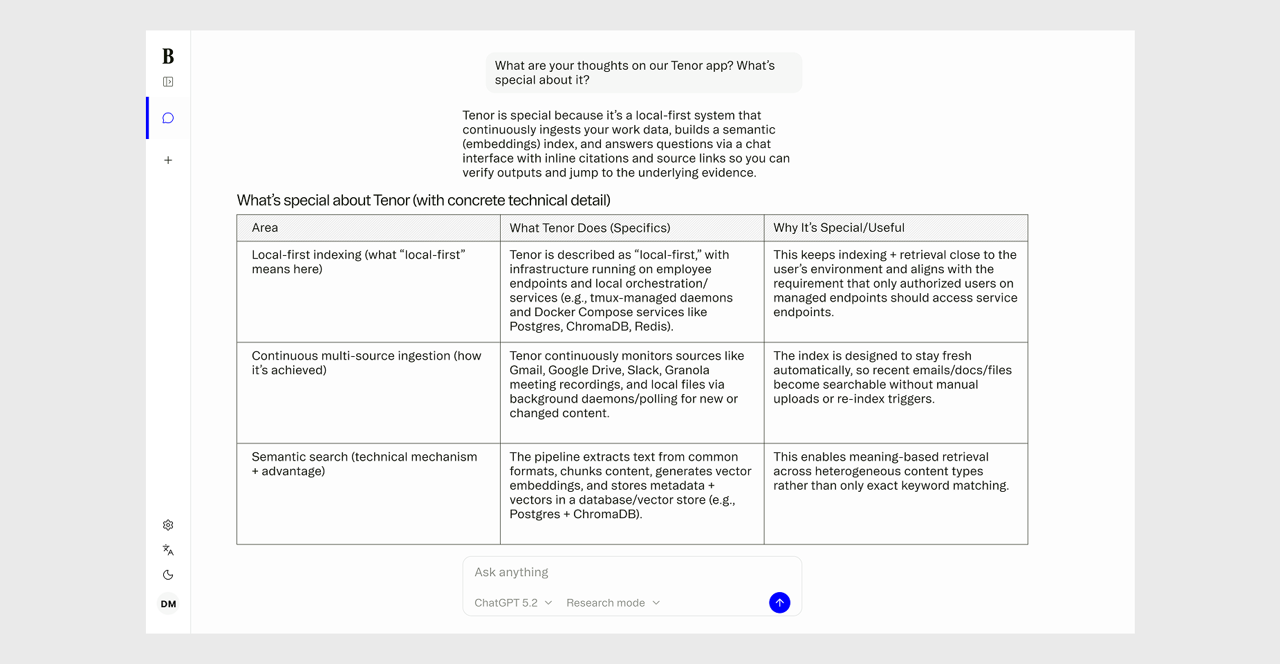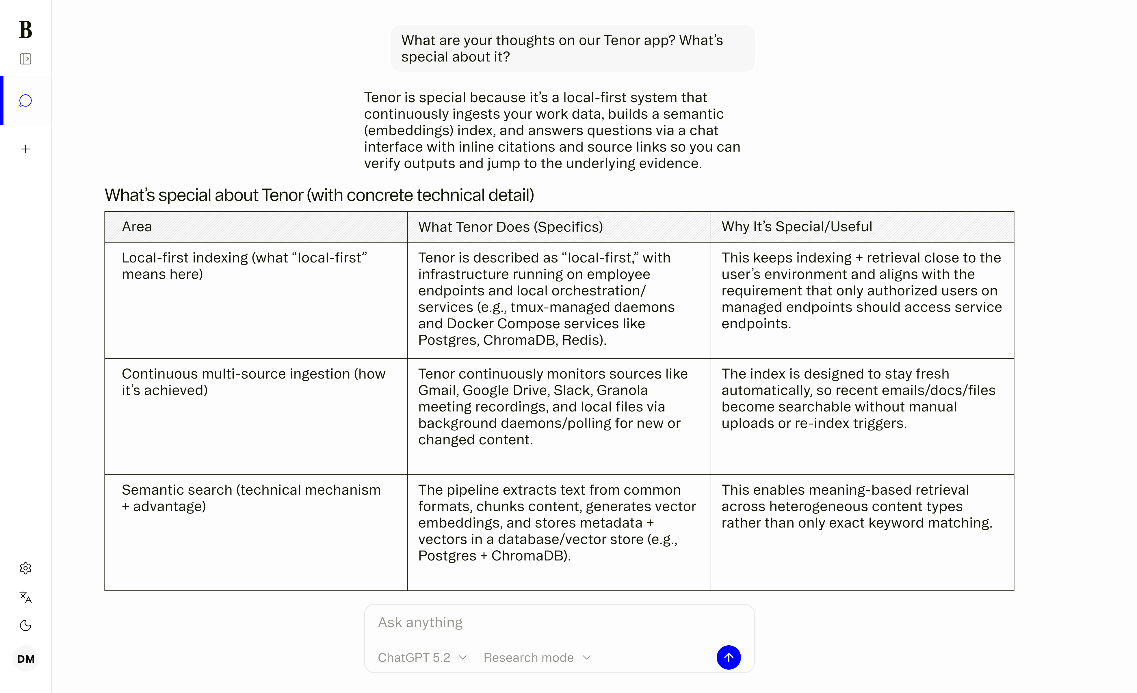 Rather than attempting to force structure to the way our team reports their work - a rather bureaucratic and naïve objective for a company of our size and growth trajectory - we set out to build a tool to organize it for us. Tenor is your personal, local-only knowledge hub. It fetches data you have access to from a diverse range of sources and indexes it. You can chat to Tenor, and it will leverage this data together to call LLM services to provide you with the answer you are looking for. Save for the LLM calls which are configured to be zero data retention, everything stays in your computer; there is no need to stress about your personal data being leaked while you sleep.